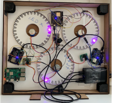 How it works: Eco-Garden is a wooden box with three disks for electricity use practices, gas use practices, and food waste practices, which are colour-coded as blue, yellow, and green, respectively. A flower sits on each disk, and a bee is attached to one of the petals which is considered as the beginning petal. The smaller flowers around each disk are connected to Addressable LEDs, which correspond to a configurable target set by users through Eco-Garden’s companion mobile application which displays detailed consumption data. The disks follow the functioning of a traditional wall clock. Initially, Eco-Garden starts with the beginning petal with the bee, at the 12 o’clock position (representing a consumption of 0). The bees gradually rotate clockwise throughout the week to show consumption, while one lit LED in each disk shows the customised target. The bees are updated every hour. The idea is not to let the bee roate beyond the target. After the set time period, the Eco-Garden resets itself (bees rotate back to zero, and user sets a target for the new week) and continues the process with new data for the next week.