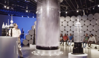 In this museum installation, four tons of (possibly fake) oil dramatically drop into a three-meter-tall glass tube in four seconds, showcasing the vast quantities of oil Kuwait produces. The liquid is pumped back up and dropped again every five minutes. The inscription on the tube reads: